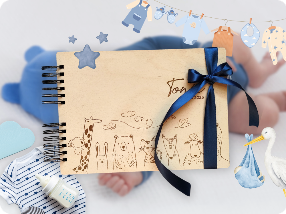 Stačí nám do "specifikace k objednávce" napsat např. jméno dítěte a album ti uděláme přesně, jako je na úvodním obrázku produktu.