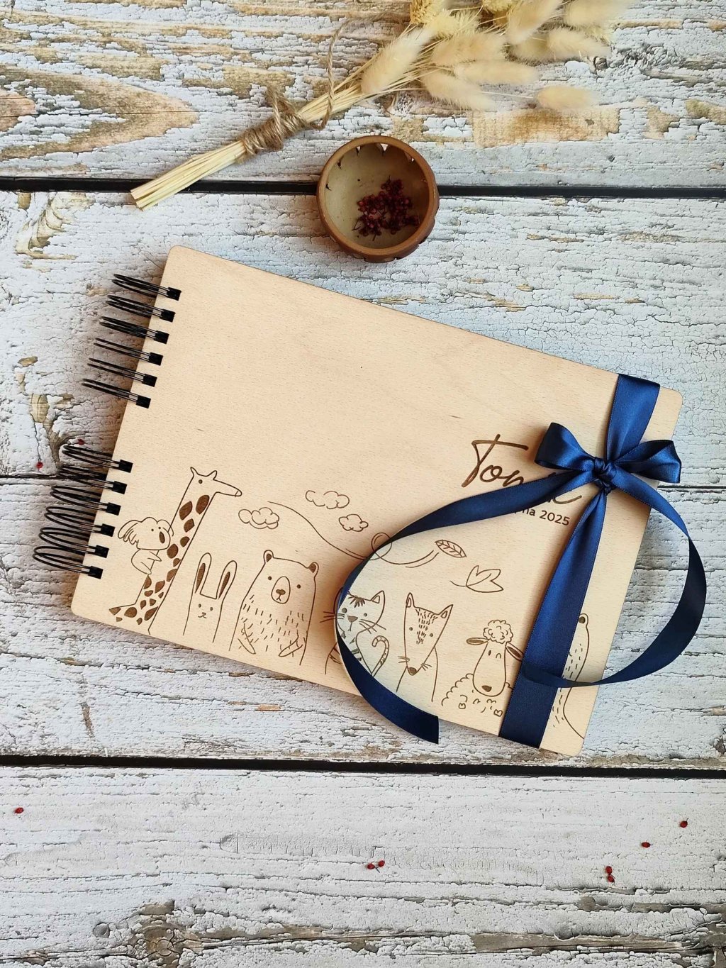 ✅ Hravý design – přírodní dřevo doplněné ilustracemi zvířátek.