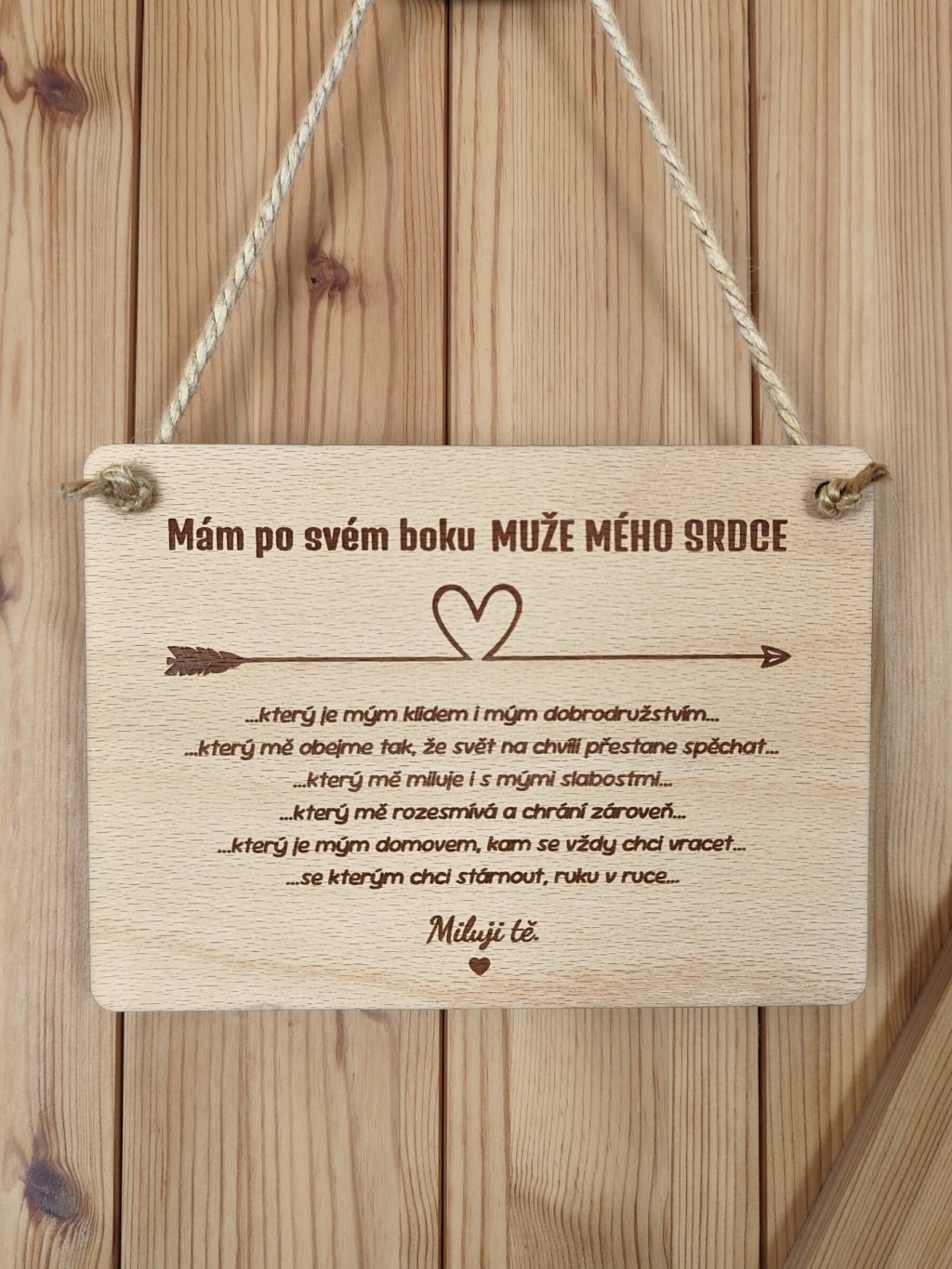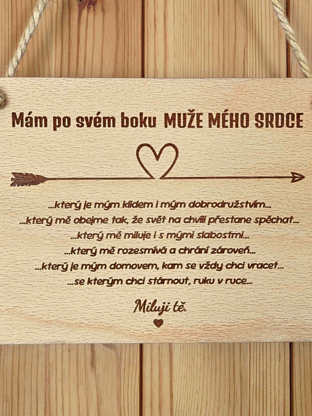 Tato dřevěná cedule s jemným gravírováním je malým, ale silným vyznáním lásky. Text plný emocí mluví o partnerovi jako o oporě, domově a největším štěstí – o muži, se kterým chcete kráčet životem ruku v ruce.