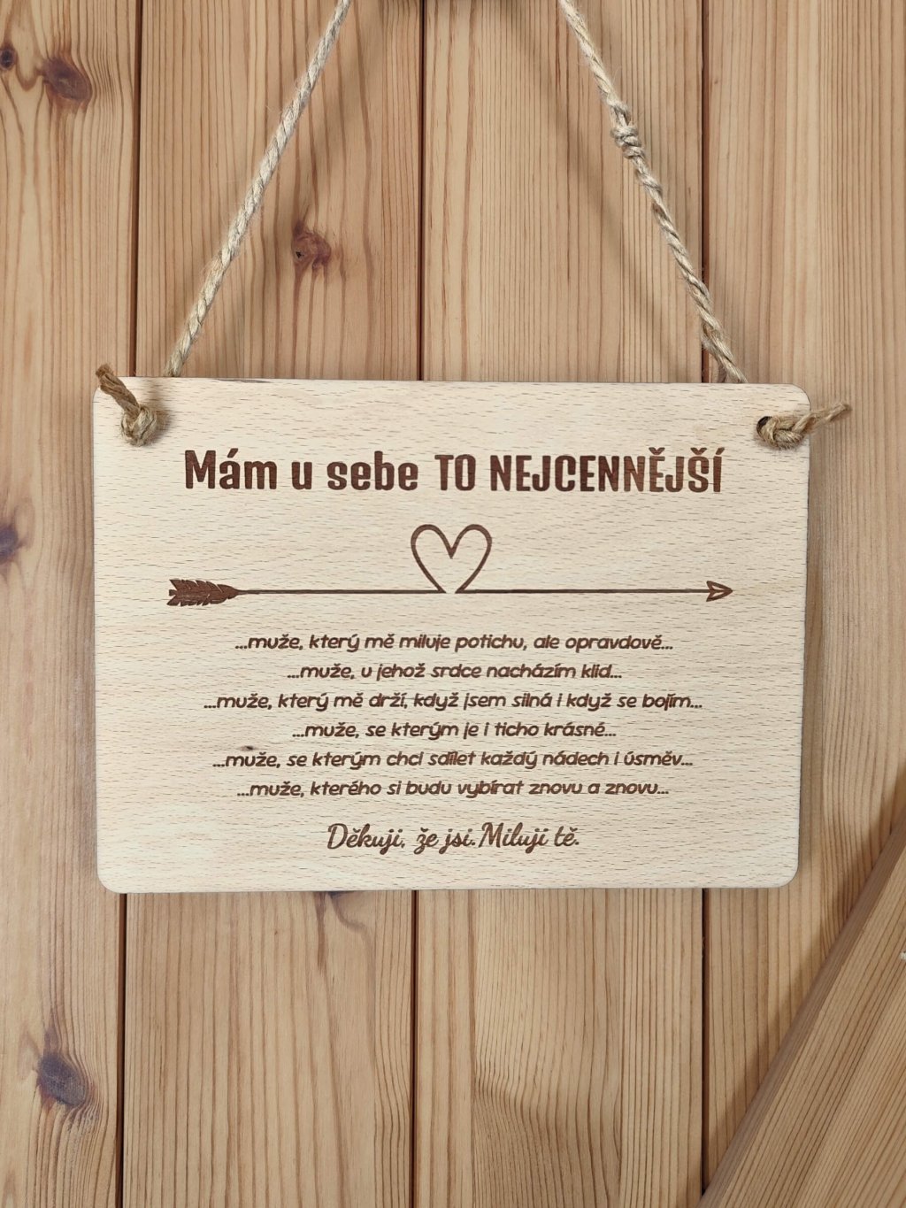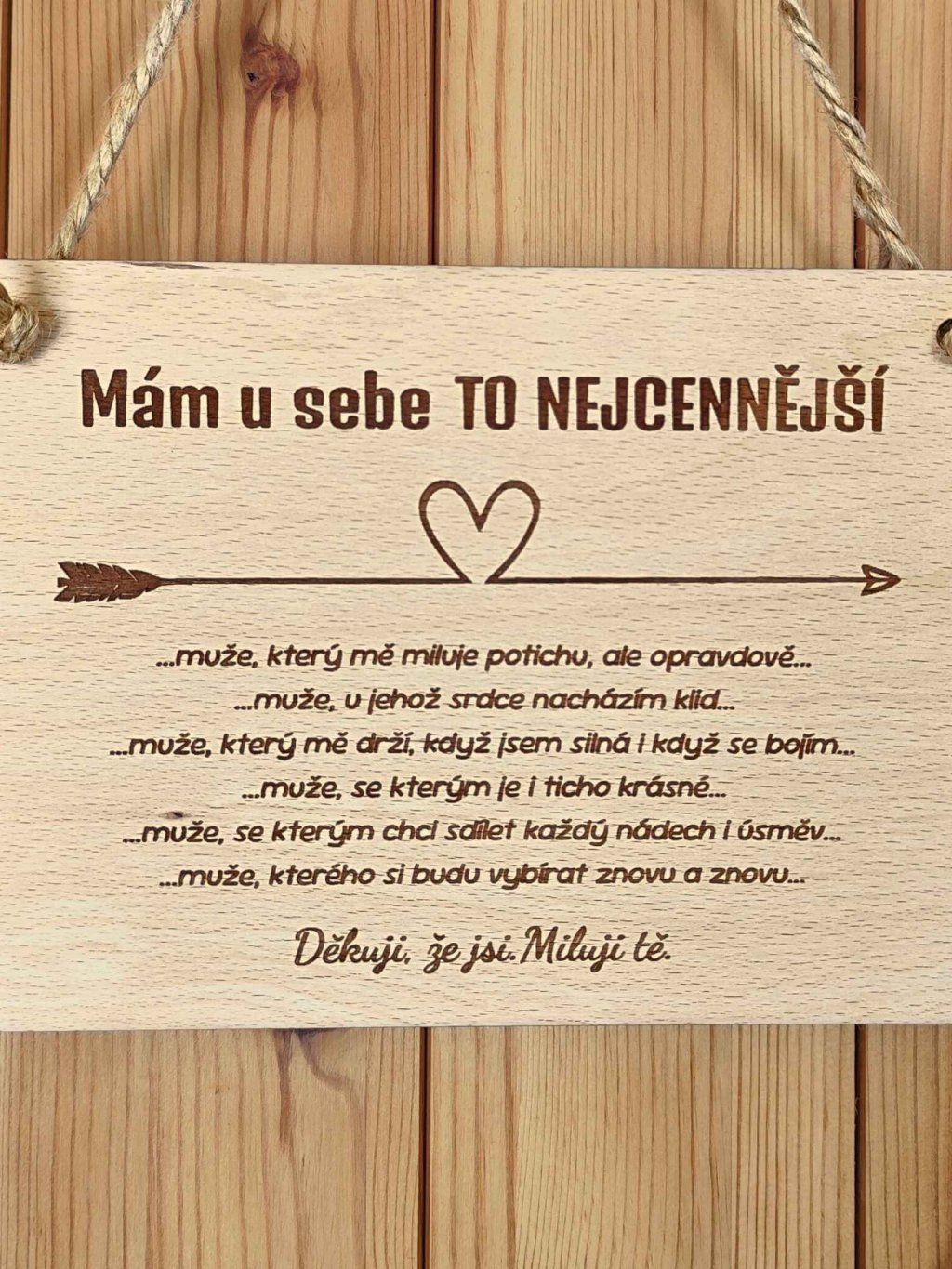 Dřevěná cedule s nápisem „Mám u sebe to nejcennější“ je originální bytová dekorace z přírodního dřeva, která vyjadřuje hluboké city, vděčnost a lásku k partnerovi nebo manželovi. Jemné gravírování a symbol srdce se šípem dodávají ceduli romantický a nadčasový vzhled.