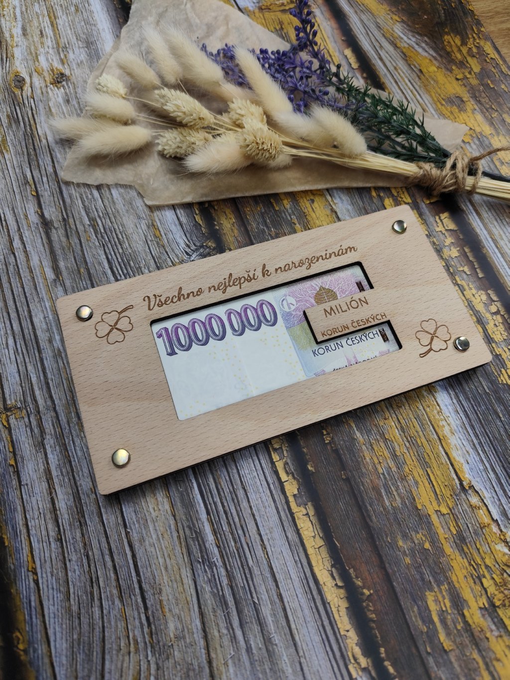Tato dřevěná obálka na peníze s vtipným nápisem je skvělým příkladem toho, jak může být darování peněz vtipné a elegantní zároveň.