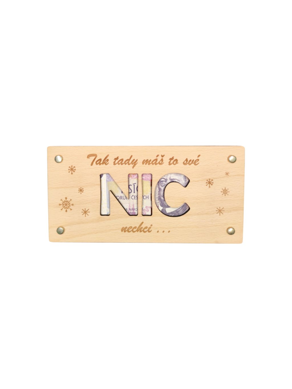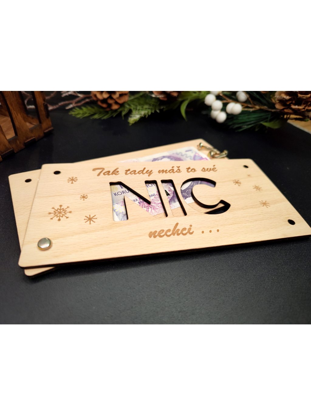 S touto dřevěnou obálkou na peníze a vtipným nápisem „Tak tady máš to své NIC nechci“ se každý dar stane nezapomenutelným zážitkem. Nejen, že obálka skvěle vypadá, ale také přináší nový rozměr darování peněz.