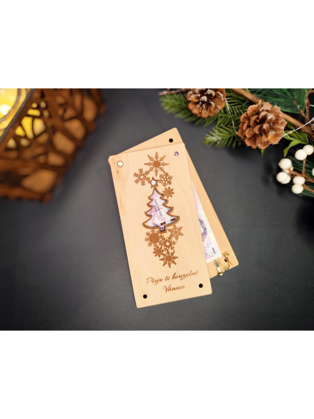 Dřevěná obálka na peníze s vyřezaným vánočním stromečkem a nápisem "Přeju ti kouzelné Vánoce" je skvělým způsobem, jak předat finanční dar, aniž byste přišli o kouzlo sváteční atmosféry.