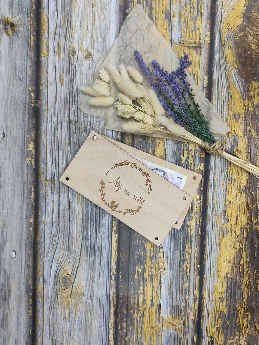 Dřevěná obálka na peníze - Vítej na světě