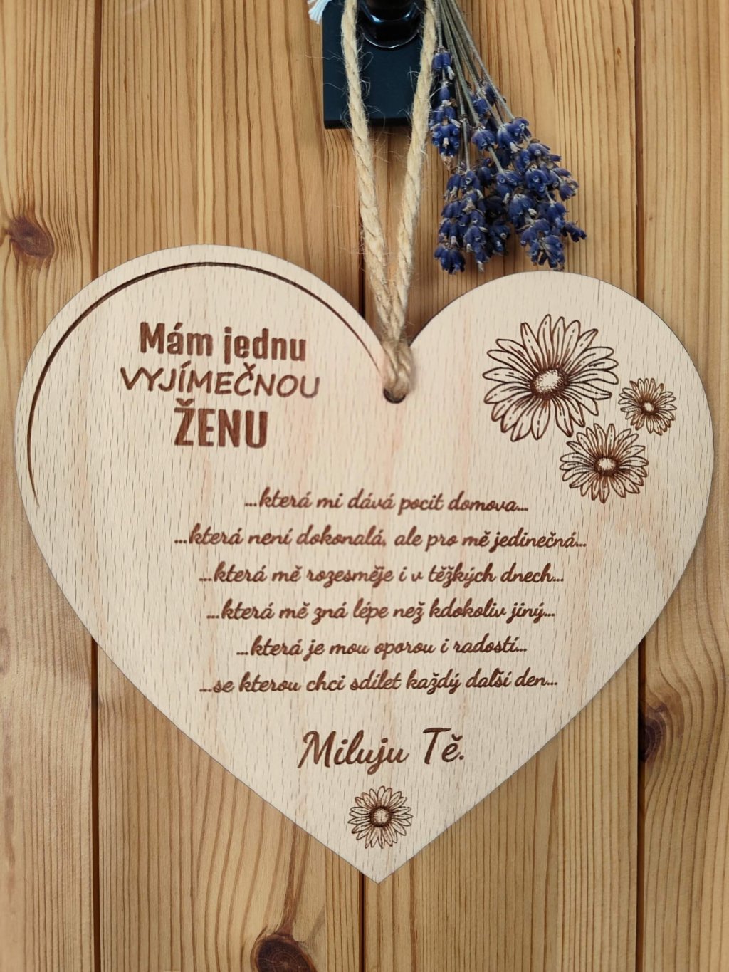 Dřevěné srdce s nápisem „Výjimečná žena“ a květinovým motivem je romantická dekorace z přírodního dřeva a krásné vyznání lásky. Ideální dárek pro ženu.