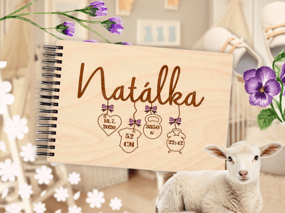 DĚTSKÉ DŘEVĚNÉ FOTOALBUM – S údaji o narození