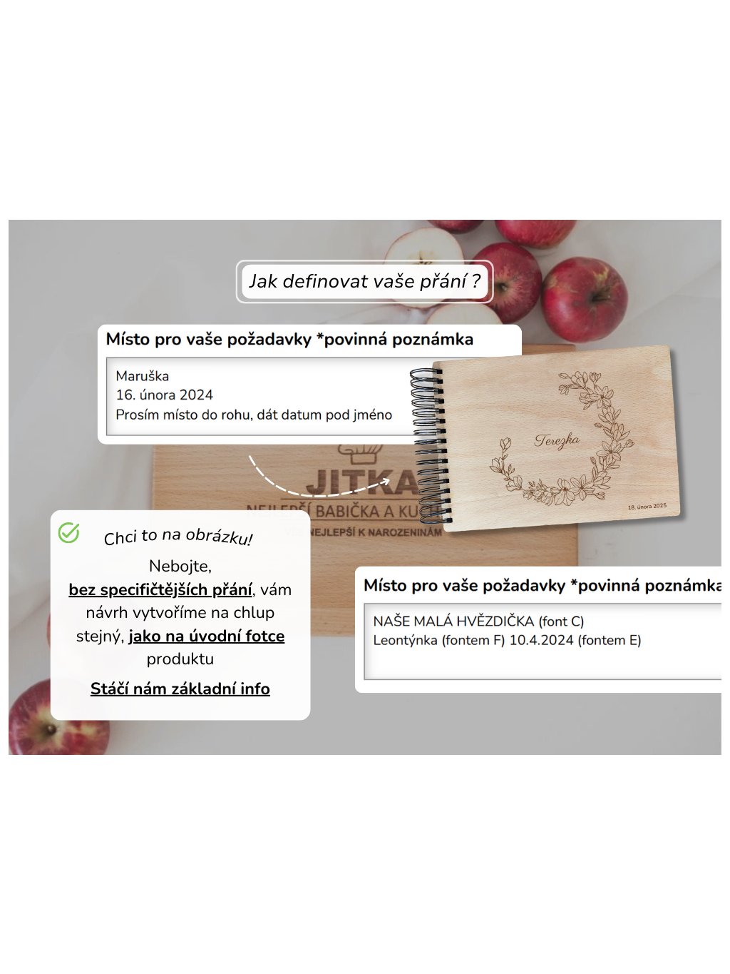 - Zvolený text (jméno, datum, věnování ...) napiš do pole "specifikace ke tvé objednávce"