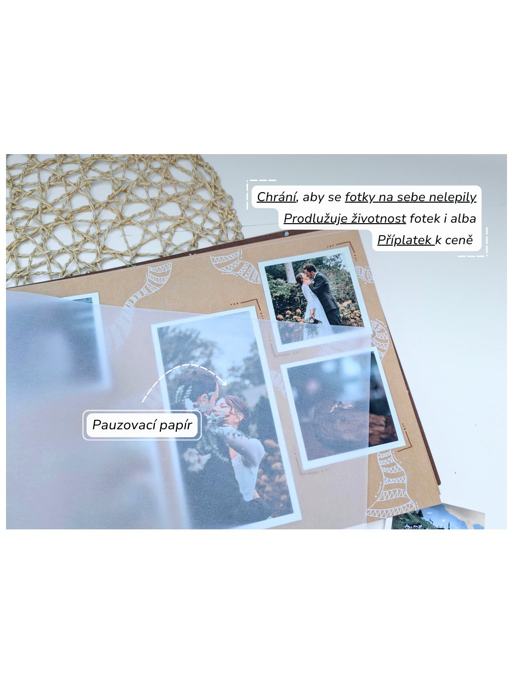 Pro vnitřní ochranu alba si můžeš přiobjednat pauzovací papíry, které ti vložíme mezi jednotlivé listy. (chrání fotky před slepením)