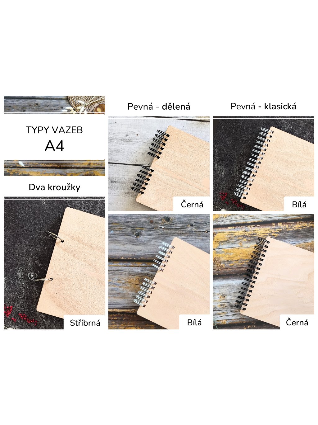 Všechna naše alba drží kovové hřbety. Můžeš si vybrat buď dva doplňovací kroužky, nebo pevnou vazbu – dělenou, nebo klasickou (viz produktové obrázky).